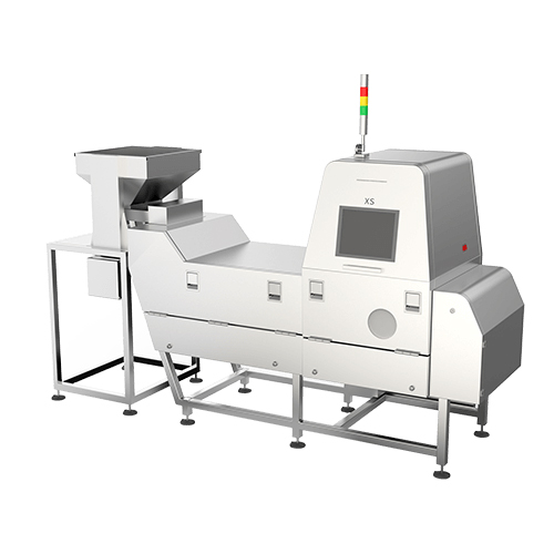 該設(shè)備廣泛應(yīng)用于堅(jiān)果、籽仁、花生、豆類、脫水果蔬、茶葉、中藥材等各類散裝物料檢測(cè),可識(shí)別并剔除金屬、玻璃、石子、土塊等,針對(duì)堅(jiān)果類產(chǎn)品,還可剔除蟲洞粒、空癟粒、皺縮粒等;物料通過(guò)進(jìn)料口進(jìn)入設(shè)備內(nèi)部,經(jīng)由振動(dòng)分料器將物料均勻鋪平于輸送帶上,通過(guò)由X光發(fā)生儀產(chǎn)生的射線對(duì)物料進(jìn)行穿透,再由視覺(jué)和模式識(shí)別將圖像的信息進(jìn)行區(qū)分、提取、判別,異物通過(guò)噴閥吹入廢料通道,成品物料由出料口排出。